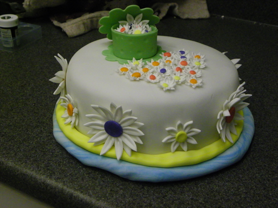 This was the last cake I did in my Wilton Classes. Those daisies took a lot of time to make and put on, but I like the way it turned out! All flowers are gumpaste, cake and cake board are covered in fondant. TFL!