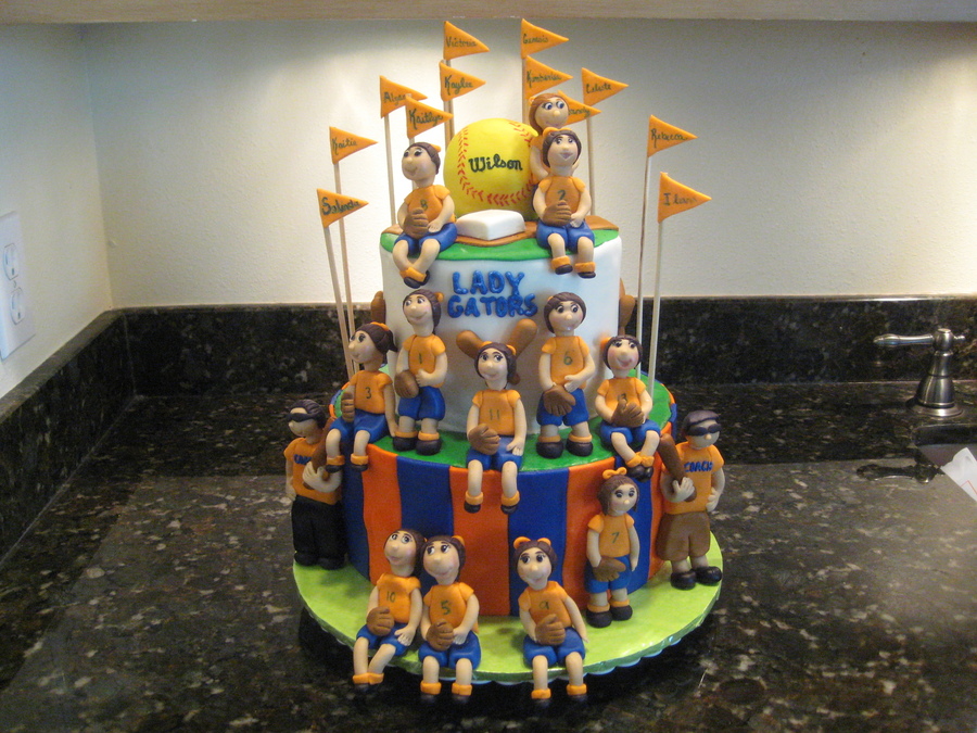 I would like to thank Humblepie for the inspiration on this cake.I did this for my daughters softball party to celebrate them winning first place in the division. Bottom tier is Macsmom's Rainbolicious with vanilla buttercream and the top tier and the softball are orange and blue zebra cake with vanilla buttercream and then decorated in mmf. All players and coaches are done in mmf. This cake was alot of fun to do!