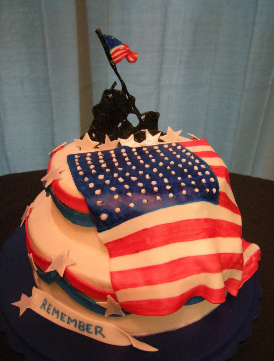 10 inch and 8 inch round marbled cakes covered in crusting buttercream. Buttercream swags with gumpaste stars, banner, and statue plaque. Fondant flag painted with food coloring and vanilla extract. Plaque is also painted with food coloring and vanilla.