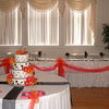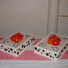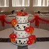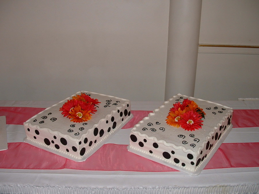 Very fun to do black and white theme with hot pink and hot orange gerber daisies. All fondant except the swirls. Those were piped on with royal.