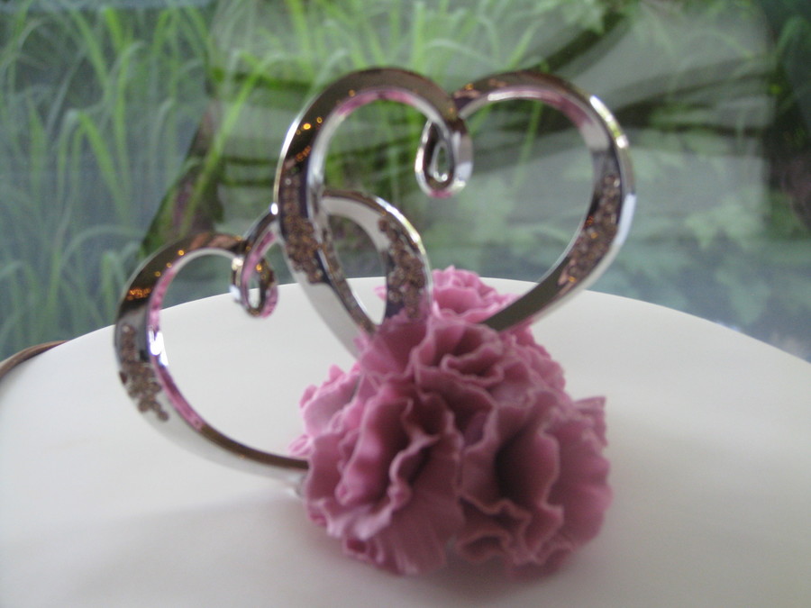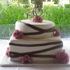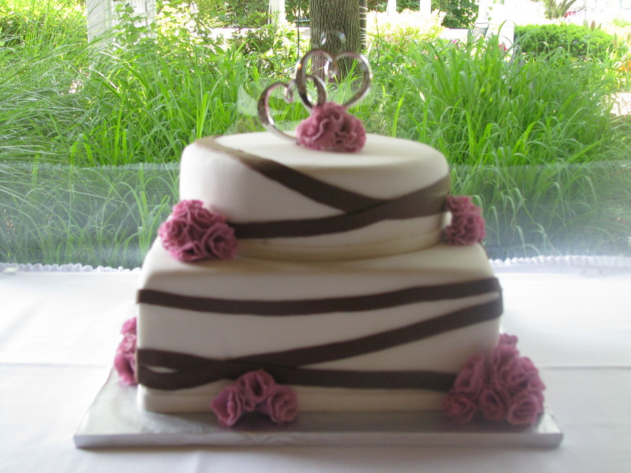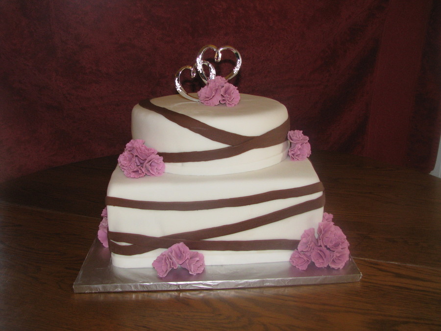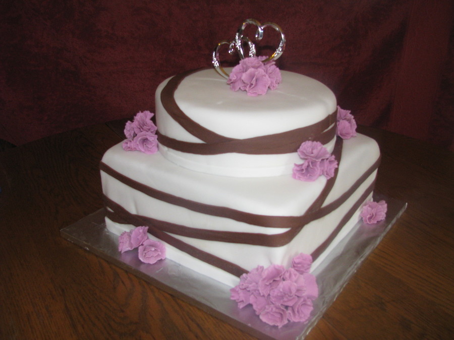 This was a pretty simple wedding cake, bottom layer 3 layers of 12 inch square with 2 layers of 10 inch round on top. The flowers are a fanasty ruffled flower and the "ribbon" is a chocolate brown (the new Duff fondant). TFL