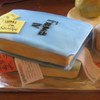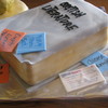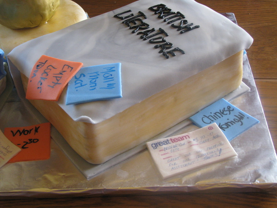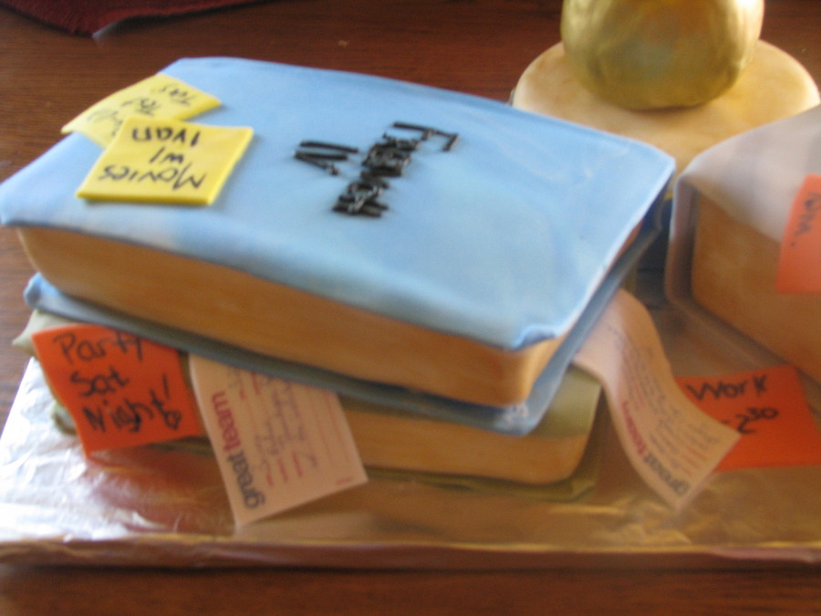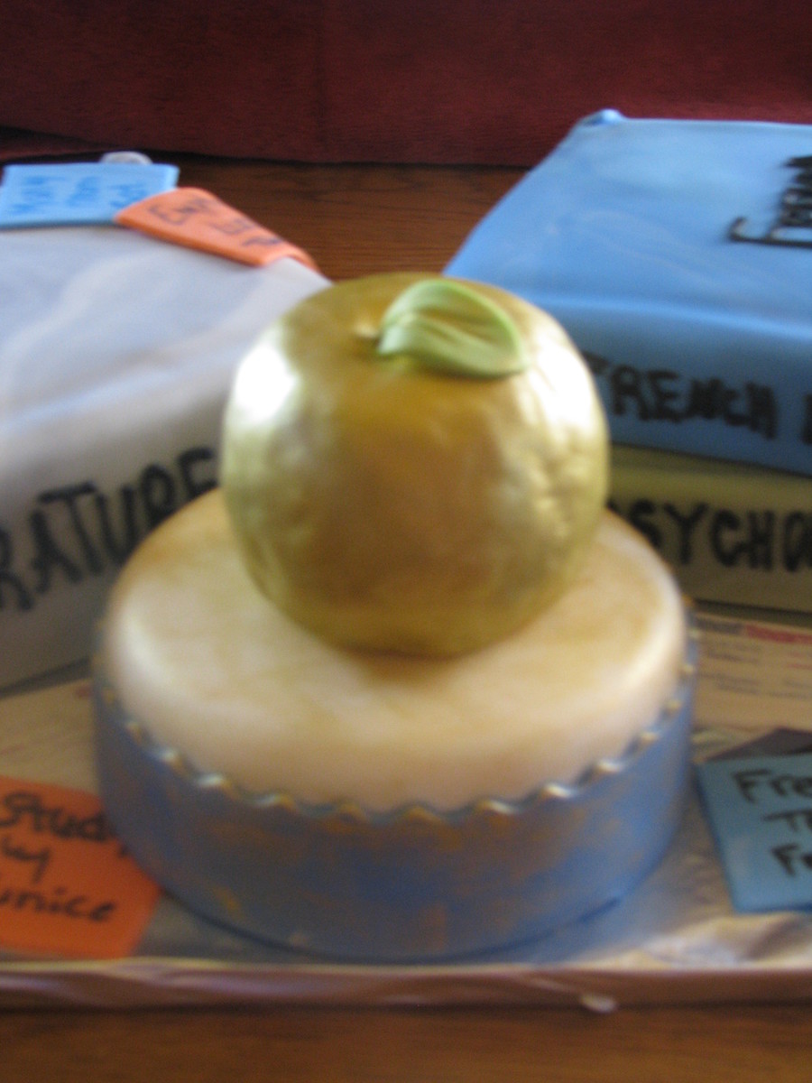 This cake was for a graduation. The girl recieving it is a Golden Apple recipient which is a great deal--hence the golden apple. She also works at a Super Target so I incorporated some Great Team cards in the design. The post-It notes are "reminders" of things she likes to do. The apple was done with rice crispy treats, covered in fondant and sprayed gold. This cake turned out really well i think! TFL