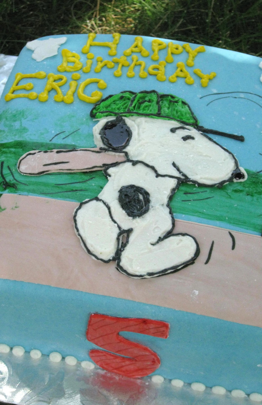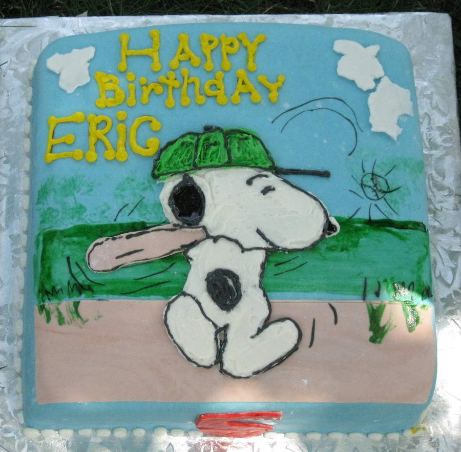 MMF covered cake w/ buttercream piped Snoopy. Fondant clouds, bat, and baseball field. I also used the Wilton Food Writer markers for the lines drawn for baseball