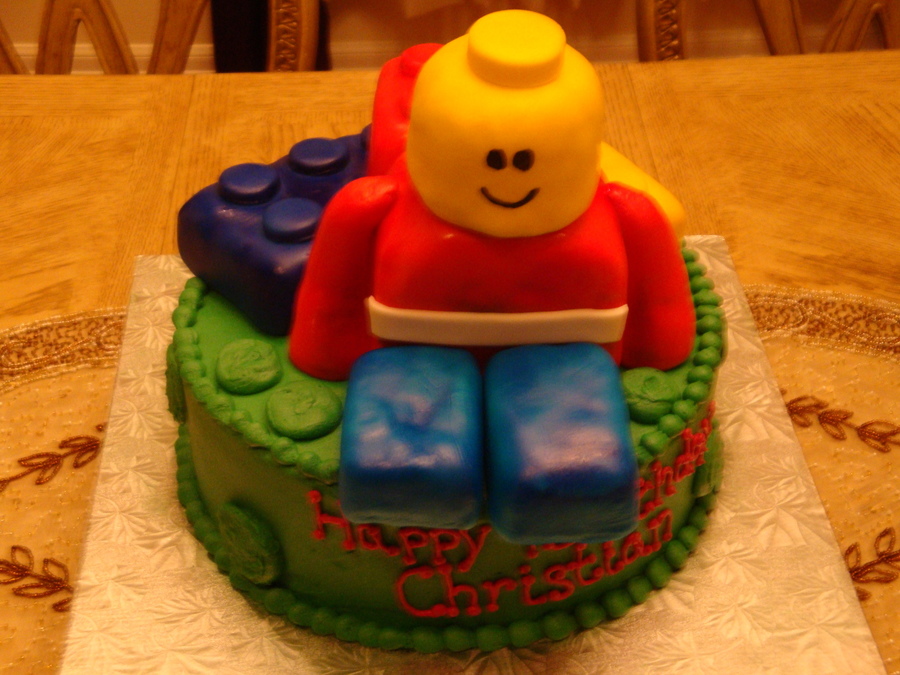 Got this idea from someone here on cakecentral & it was a huge hit. 10" vanilla cake iced in vanilla bc. Legos & Man were Rice krispie treats covered in mmf. Enoy!