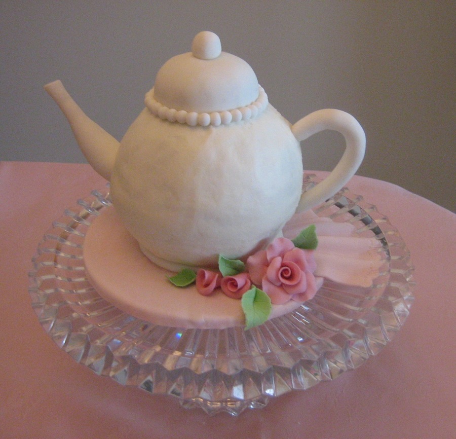 Chocolate fudge cake iced in buttercream. The "lid" was made of the trimings from leveling the 2 halfs of the ball pan. I covered the lid only with fondant, so that I would have something to hold when I pushed in the spout and handle. Spout and handle are a combo of gumpaste and fondant. Napkin is fondant (see also the closeup detail. Roses are gumpaste. The bridal shower was a high tea, so this fit in well. Also made and decorated 4 dozen mini cupcakes to accompany it.