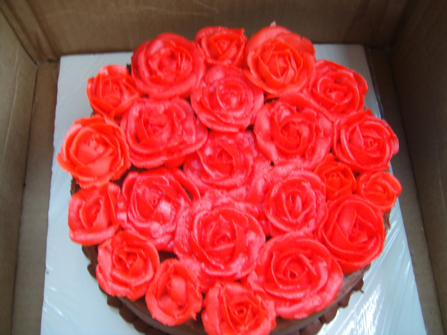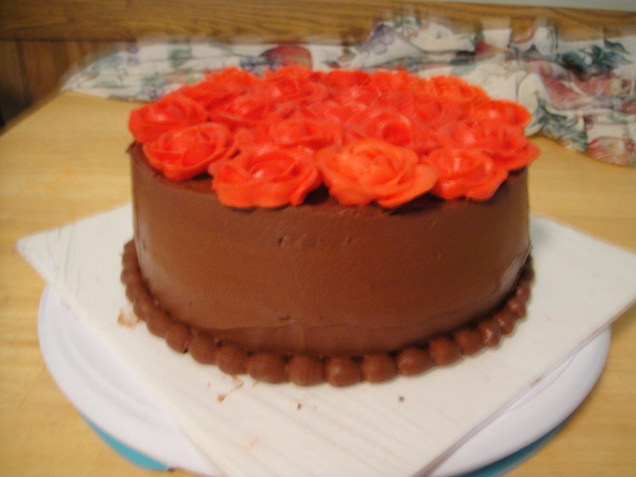 For my mom's birthday, 8" chocolate cake with chocolate mousse, chocolate ganache and covered in chocolate buttercream. I added red roses on top (her fav).