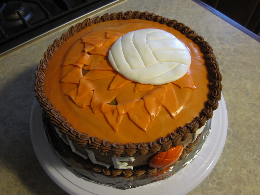 Chocolate cake with chocolate filling and fondant decorations on top.
