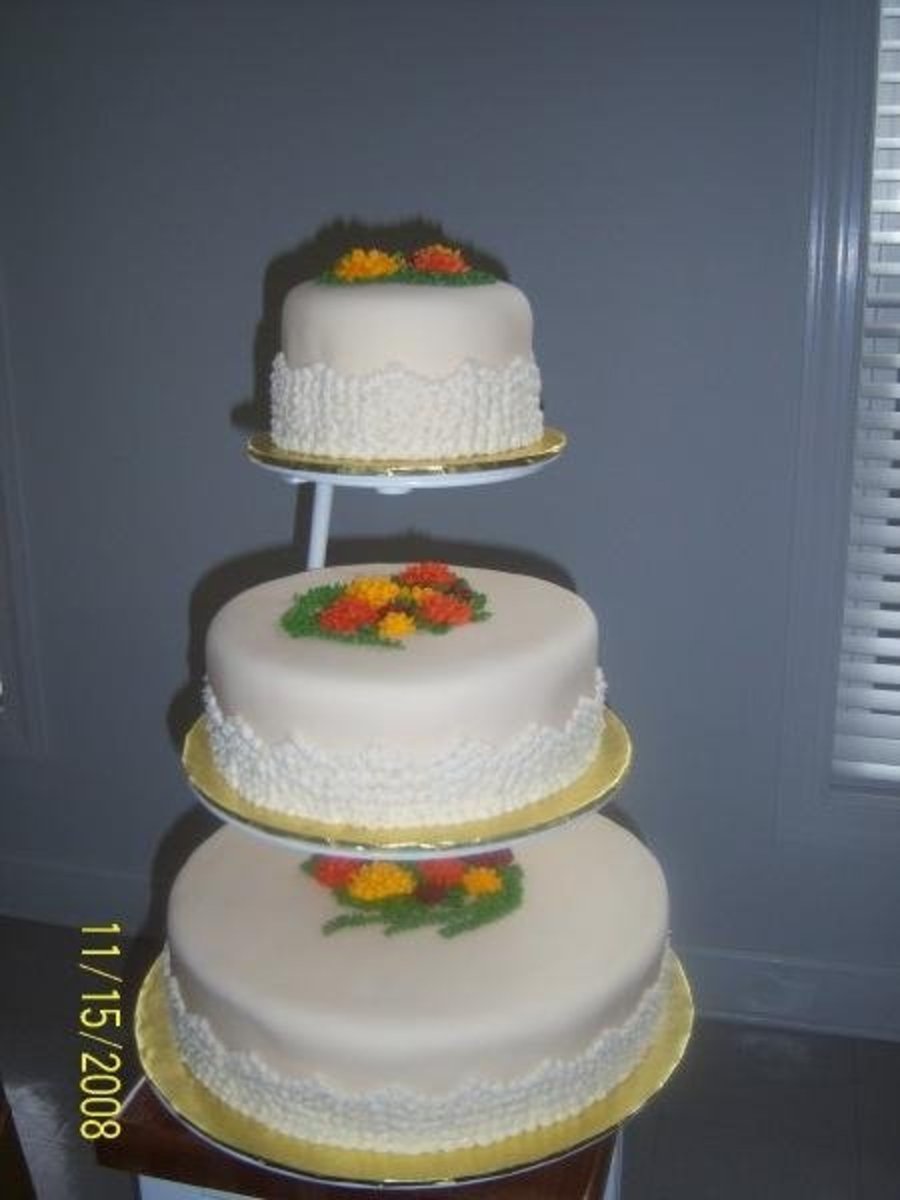 white cake with buttercream icing covered with fondant. Fall flowers on top of cake. Rosettes around sides.