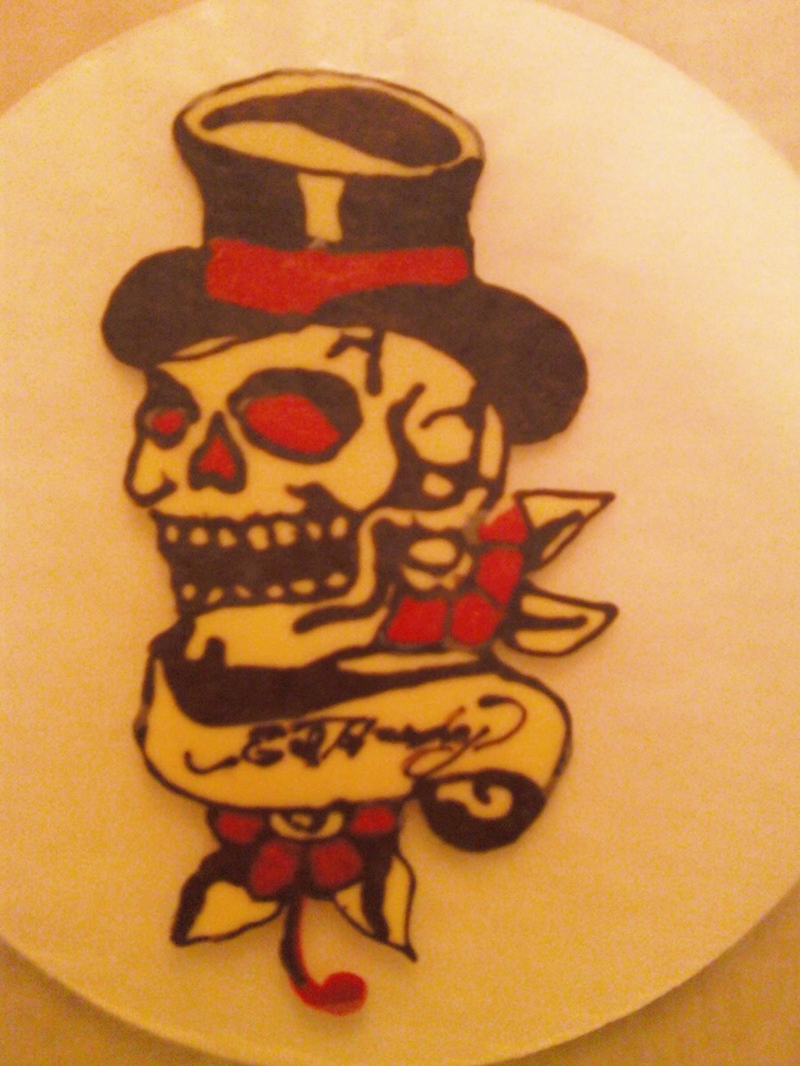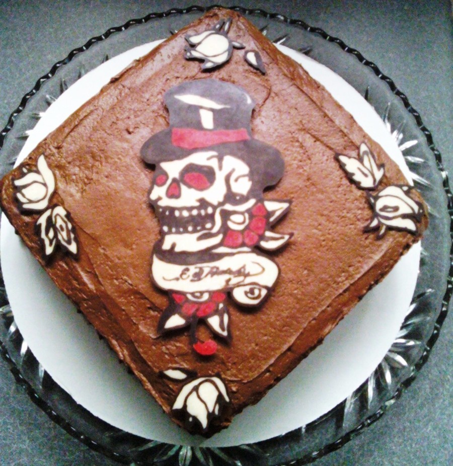 Ed Hardy Chocolate transfer, chocolate cake with a heath bar buttercream filling.