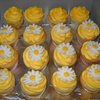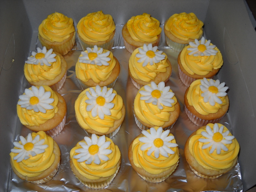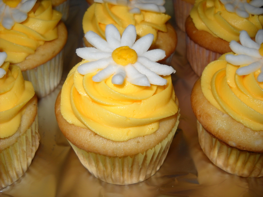Vanilla cupcakes with vanilla buttercream. The daisies are also made of buttercream.
