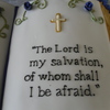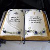 This bible was hand carved from three 1/4 sheet cakes. Covered in MMF. Buttery yellow cake with raspberry filling.