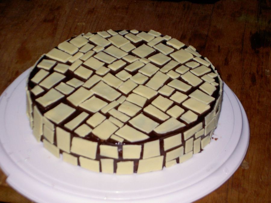 My first attempt at a mosaic cake. Chocolate cheesecake, covered in chocolate ganache, wtih white chocolate tile. Very rich.