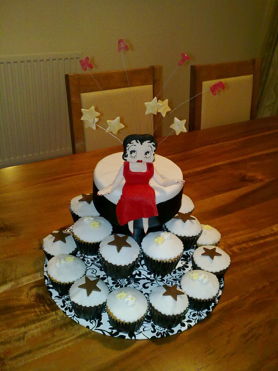 Birthday cake made for a friends daughter. The cupcakes are chocolate orange and lemon. The top is fruitcake graced by Betty Boop which is made from gumpaste.