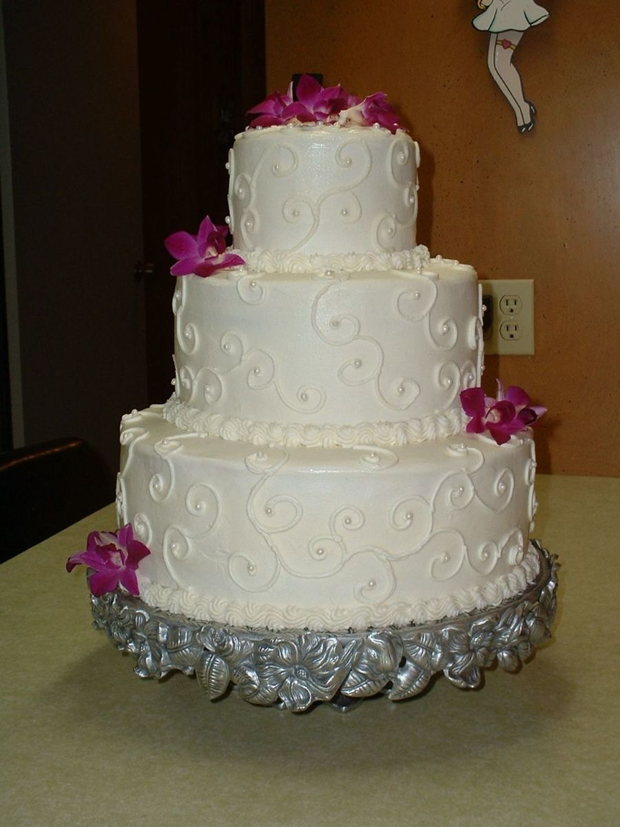 White Chiffon with vanilla custard and strawberry fillings....buttercream and fresh cimbidium orchids