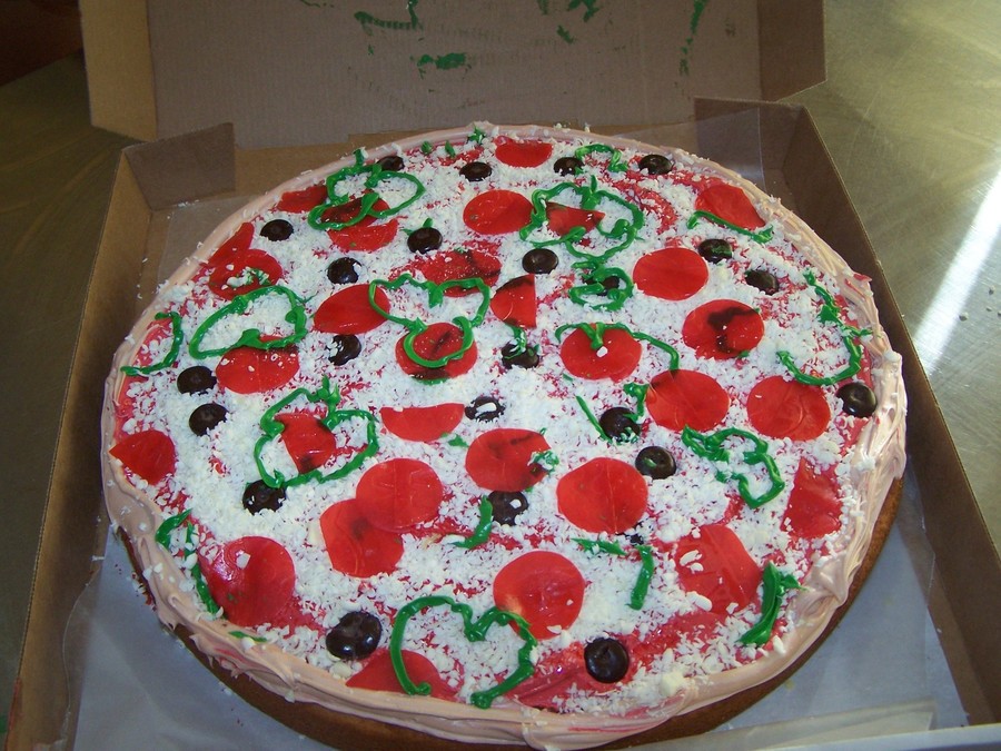 Fun cake made for a little girl's birthday pizza party! Buttercream iced with fondant topping!! The local pizza shop gave me the box! The girls loved the cake!