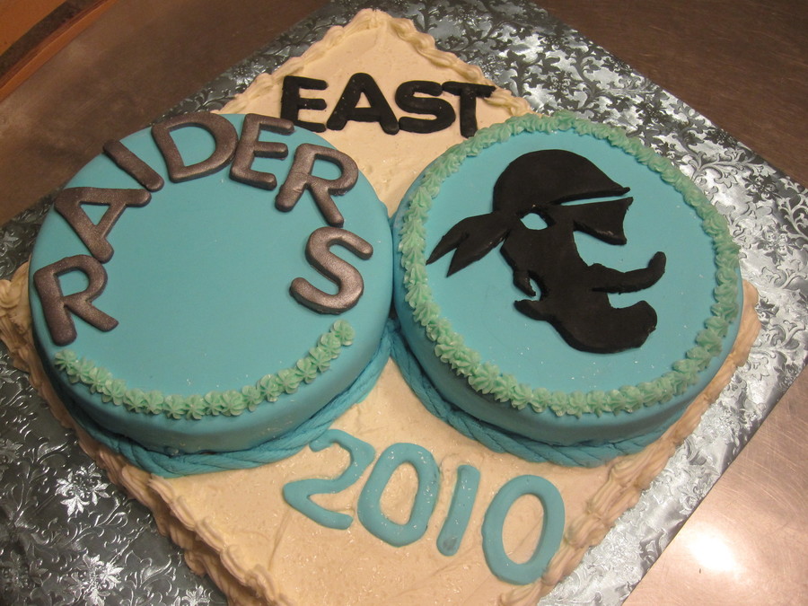 A cake made for the school where I work. we are the RAIDERS and the pirate mask is our logo. I had fun making this one because it was a special celebration for some of our students and they love it!