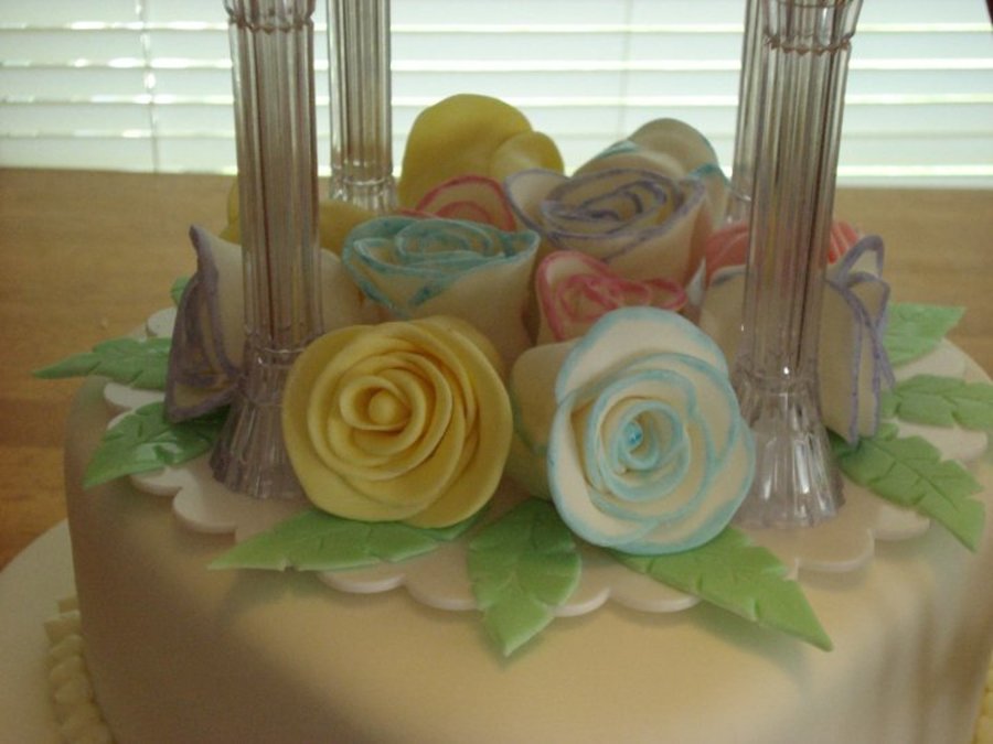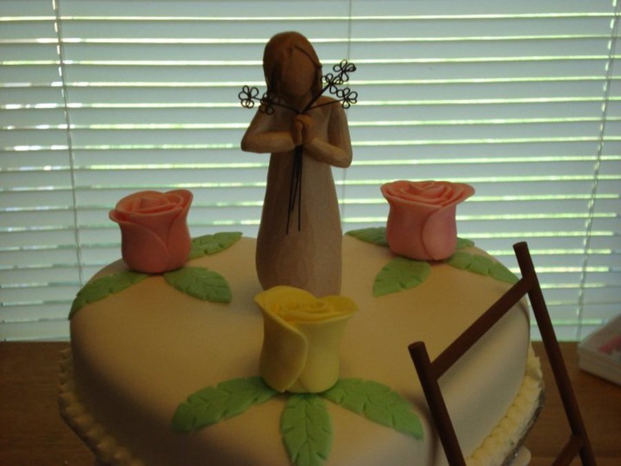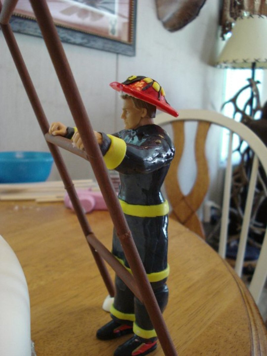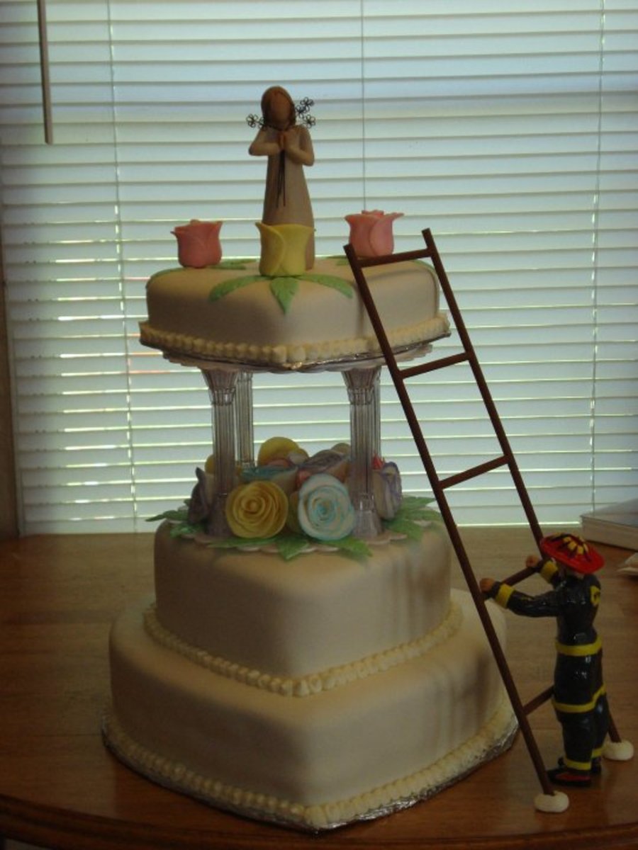 This is a double layered 3 tier red velvet wedding cake with handmade fondant flowers, leaves, as well as fondant clothing on the fireman. The fireman is a figurine covered in "fondant" to make the clothing/helmet look like a fireman. The topper is a willow tree figurine. It is homemade marshmallow fondant.
