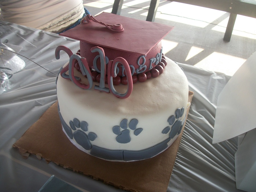 10'in round filled with Vanilla IMBC and 6'in round filled with Oreo IMBC both covered with vanilla IMBC and covered in MMF. Mortar board and numbers are gumpaste. Pawprints and congrats are fondant. TFL