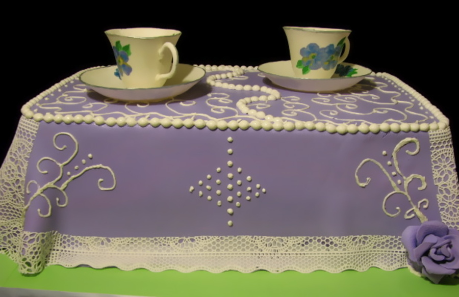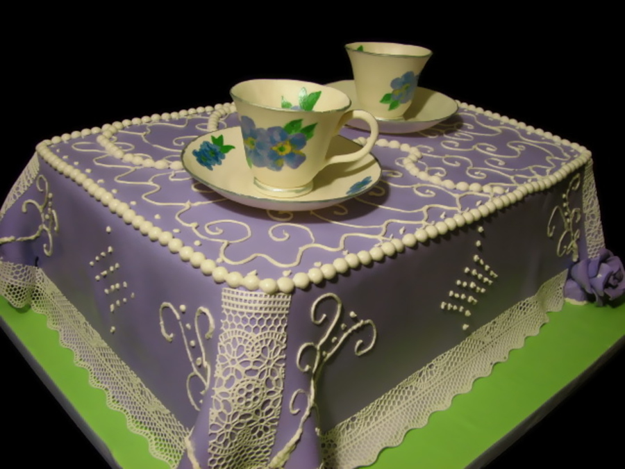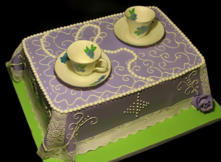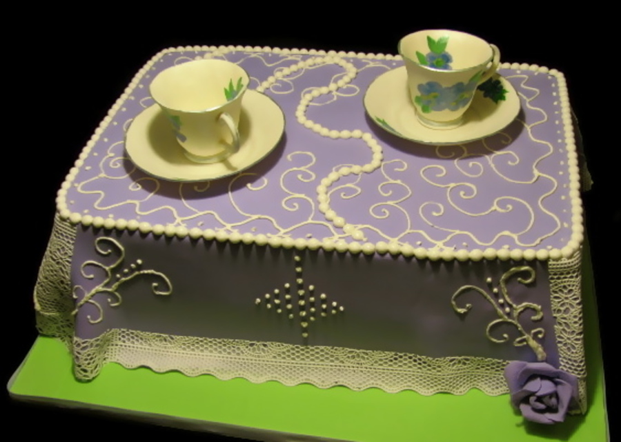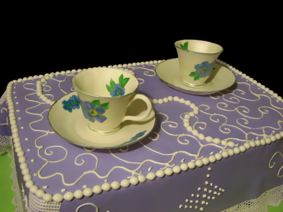 Made for a "Tea Party" themed bridal shower. Was a lot of fun and I got to use the sugarveil icing that I just bought! Tea cups and saucers are gumpaste. Lace is sugarveil.