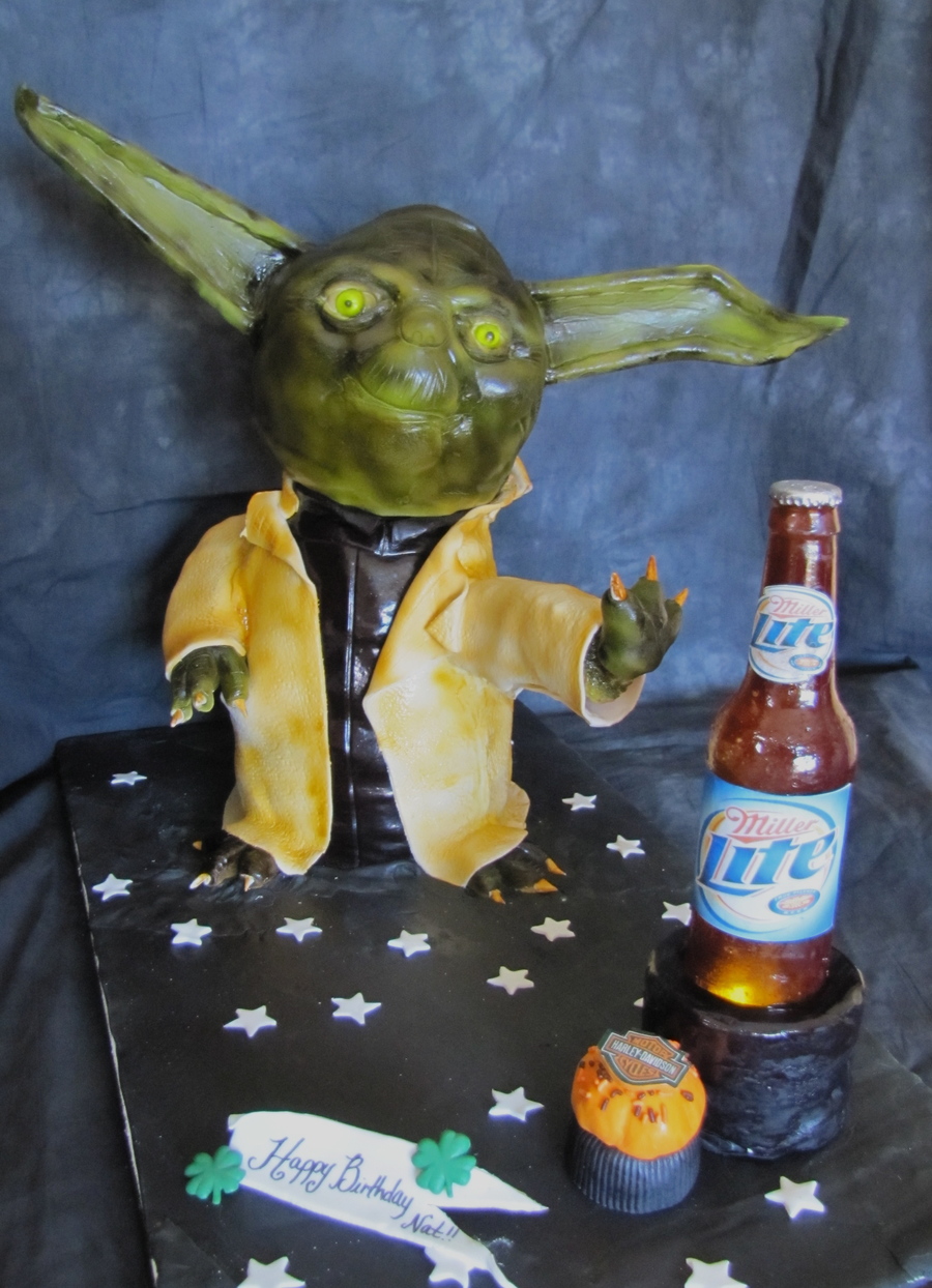 I made this cake for my girlfriends birthday. She loves Yoda! She also loves miller Light So I made Yoda using the Force to get the beer. Also She rides a Harley and is Irish, so I included a Harley cupcake and a few shamrocks. Yoda was made out of all cake and fondant and the bottle was sugar with editable labels. Thanks for looking.