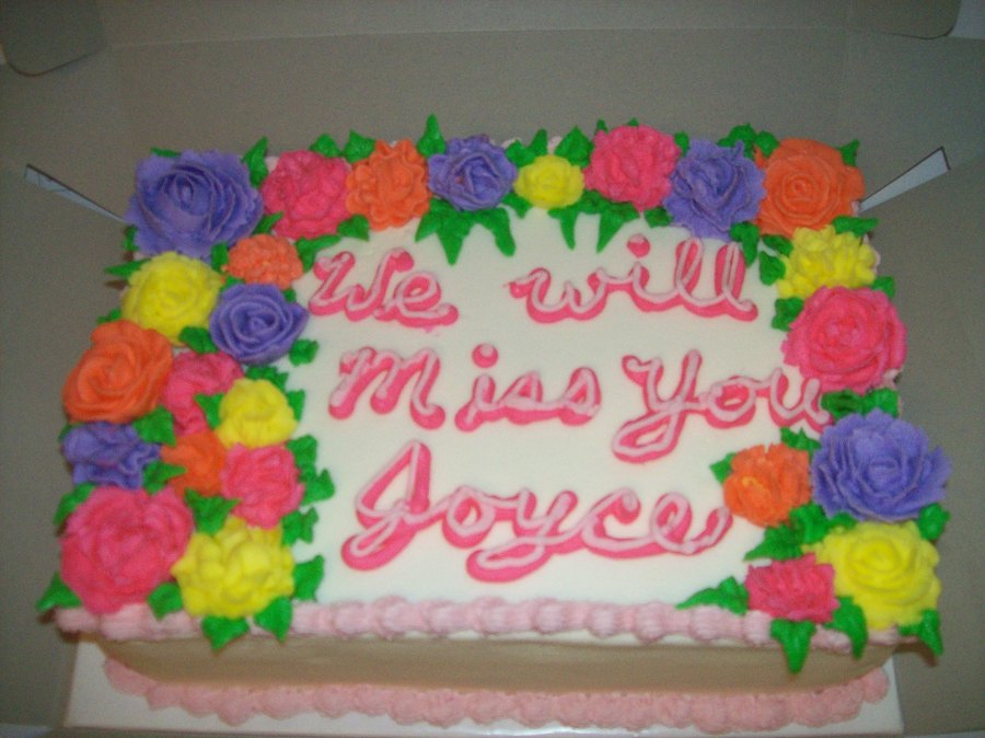 Double layer 1/2 & 1/2 chocolate/vanilla cake filled with Italian Cream -quarter sheet. Made for a lady leaving our school cafeteria...All buttercream icing and flowers.