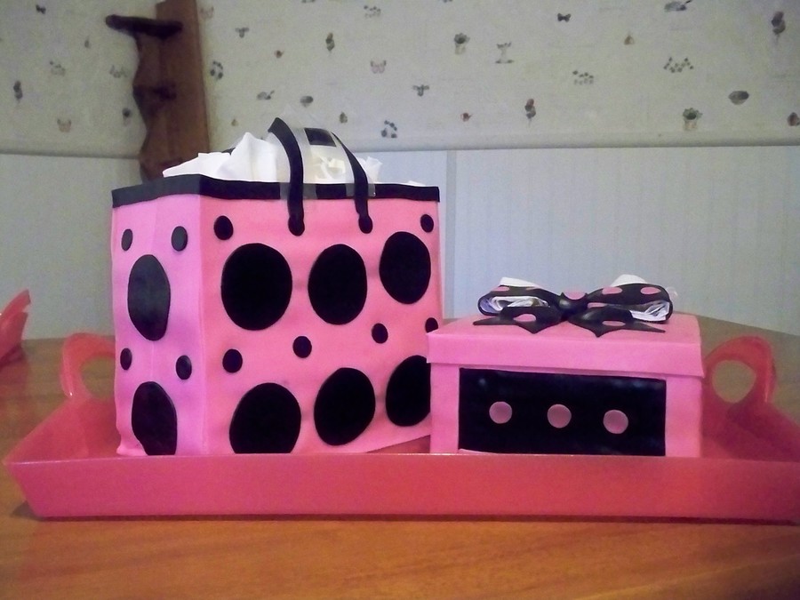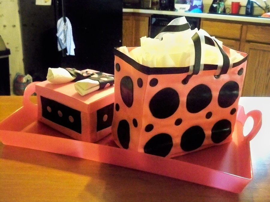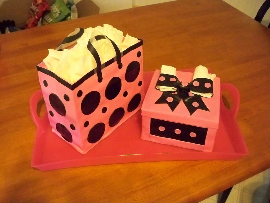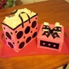 Birthday cake for a 13 yr old. I was pleased with how the bow on the box and the tissue paper in the bag turned out. If I did this again I would make the bag a different way. Box is chocolate cake with chocolate icing, bag is white cake with vanilla icing. All decor is pre-made fondant. Sorry about the napkins and wax paper left on for the picture!