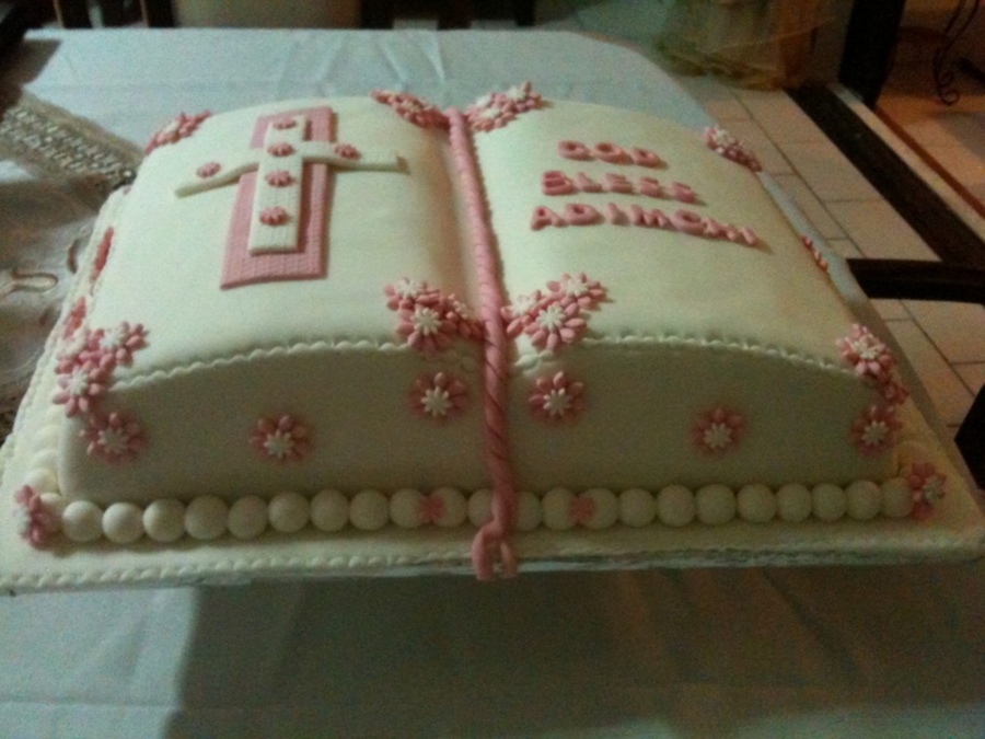 I made this cake with wilton's book pan for a girl that had her first holy communion. I used fondant to cover the cake and to also make the flowers and the cross.