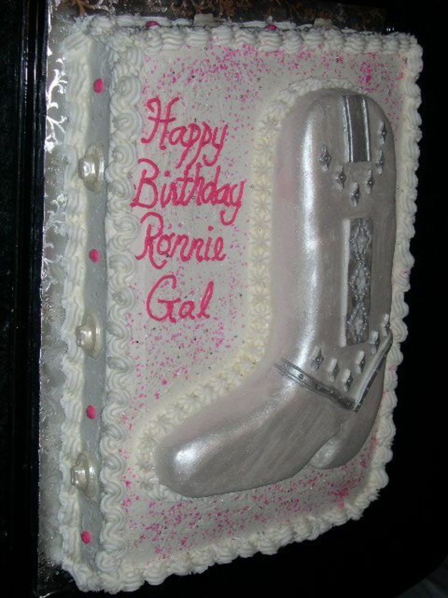 I free-hand cut this cowboy boot out of a 9X13 pan and then placed it on a half a sheet cake. It is painted with pearl luster dust. The boot designs were made using Wilton fondant tools, painted with nu silver and have small silver balls as accents. The cowboy hats around the side are white chocolate made from a candy mold, painted with pearl luster dust.