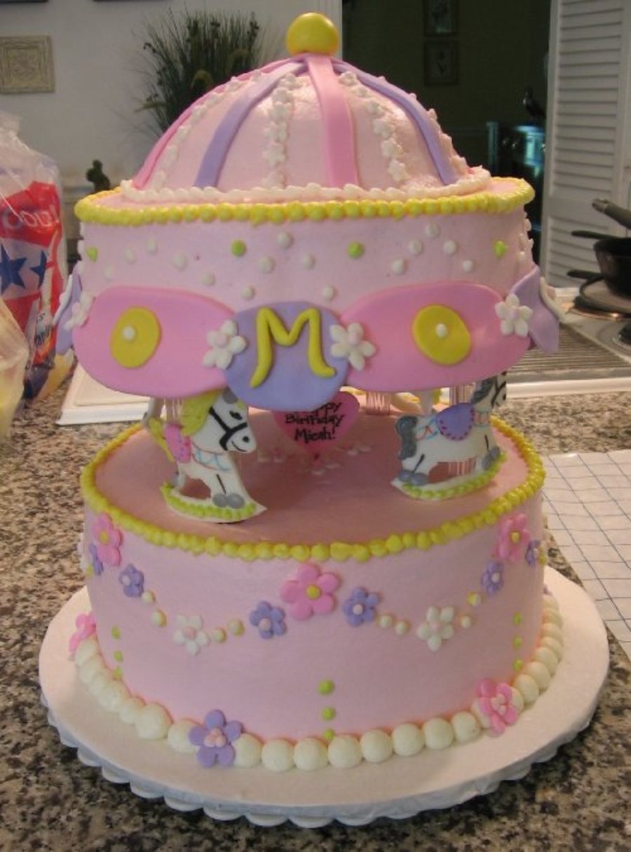 My last minute attempt at a carousel cake with no kit! Bottom is 9" rounds, and top is ball pan on a single 8" round. Iced in buttercream with fondant decorations.