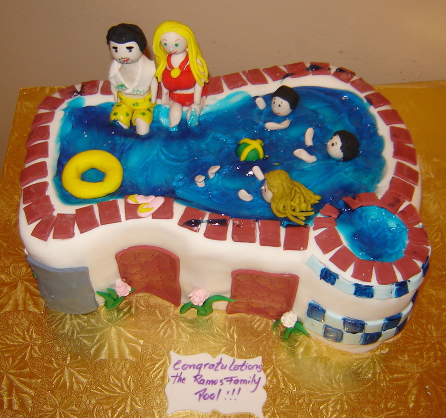 I made this cake for a pool party. I made all the family on the cake. It was 100% edible, everything was cake. I make the figurines out of gum paste, and the water was blue piping gel. Thank you for looking this picture