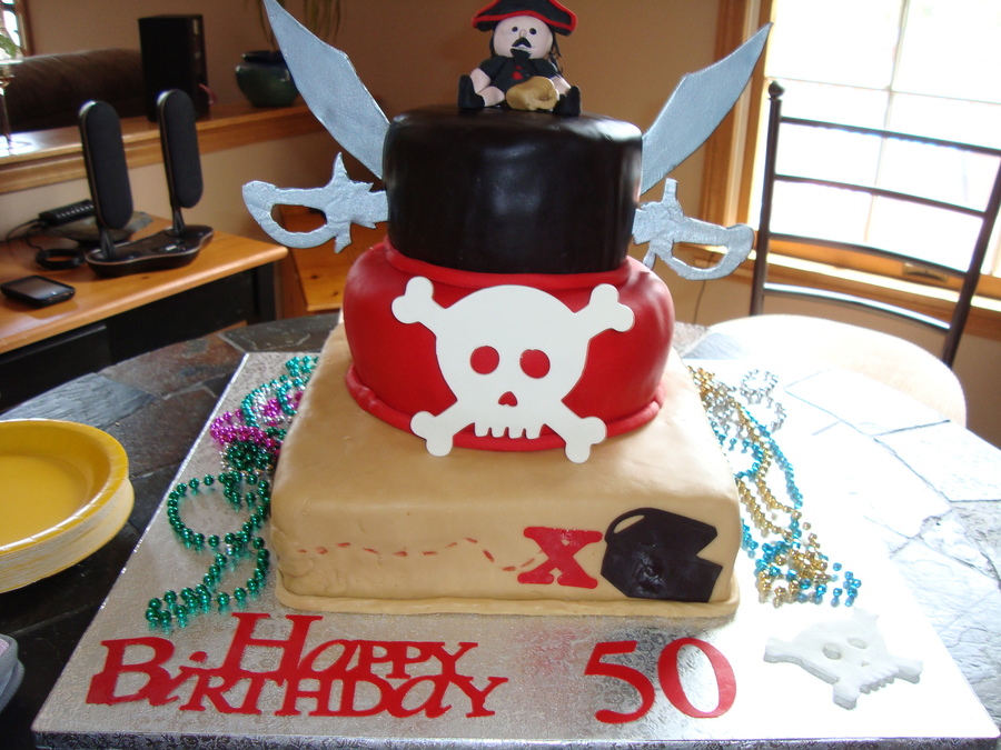 Made for dh 50th birthday. Bottom layer was mojito flavored cake covered in fondant. Fondant pirate figure and mug. Gumpaste decorations.