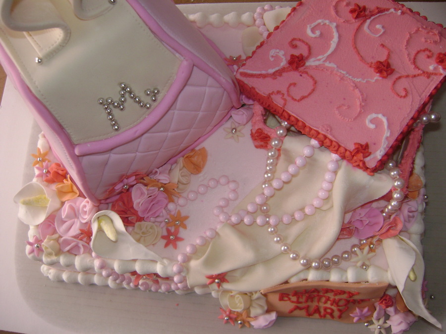 This is my first purse cake, and I chickened out on a larger one, So I put it on a sheet and added a white chocolate jewerly box that I frosted and tried to make look like crushed velvet, and filled it with a fondant scarf and real beads. I think it turned out ok.