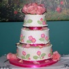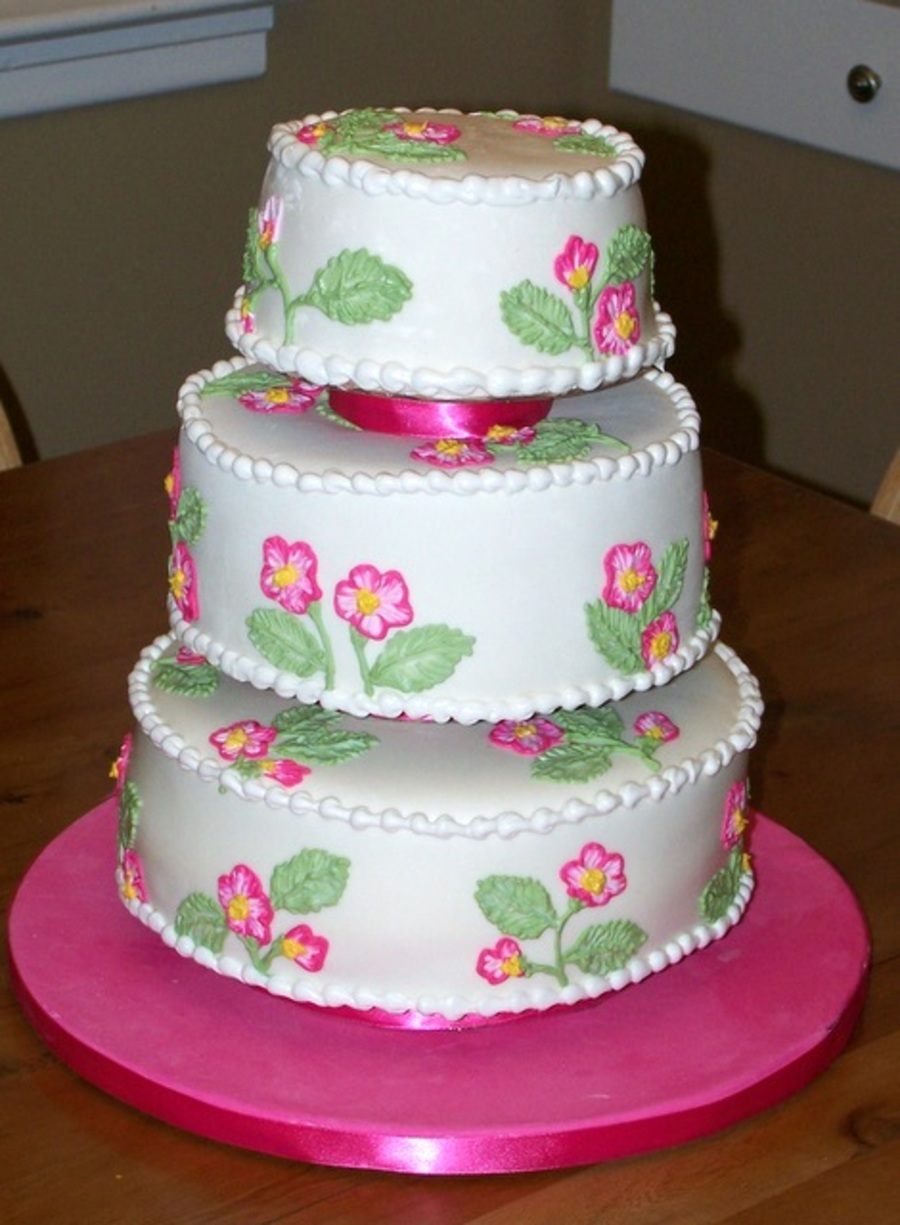 Based on a cake in Party Cakes by Peggt Porschen. Top tier is Vanilla Bean Sponge Cake with Strawberry Buttercream, Middle is Chocolate with chocolate buttercream and bottom is Lemon Cake with Lemon Curd Buttercream. Cake is covered in MMF and roses are painted with RI.