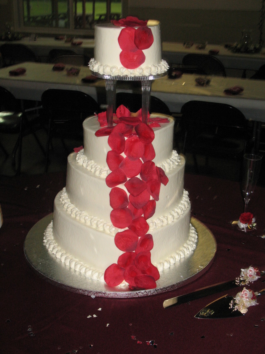 Cake is iced and filled in all BC. The 3 bottom tiers are hearts the top is a round. On a clear plate with spiked pillars. Fake rose petals. TFL.