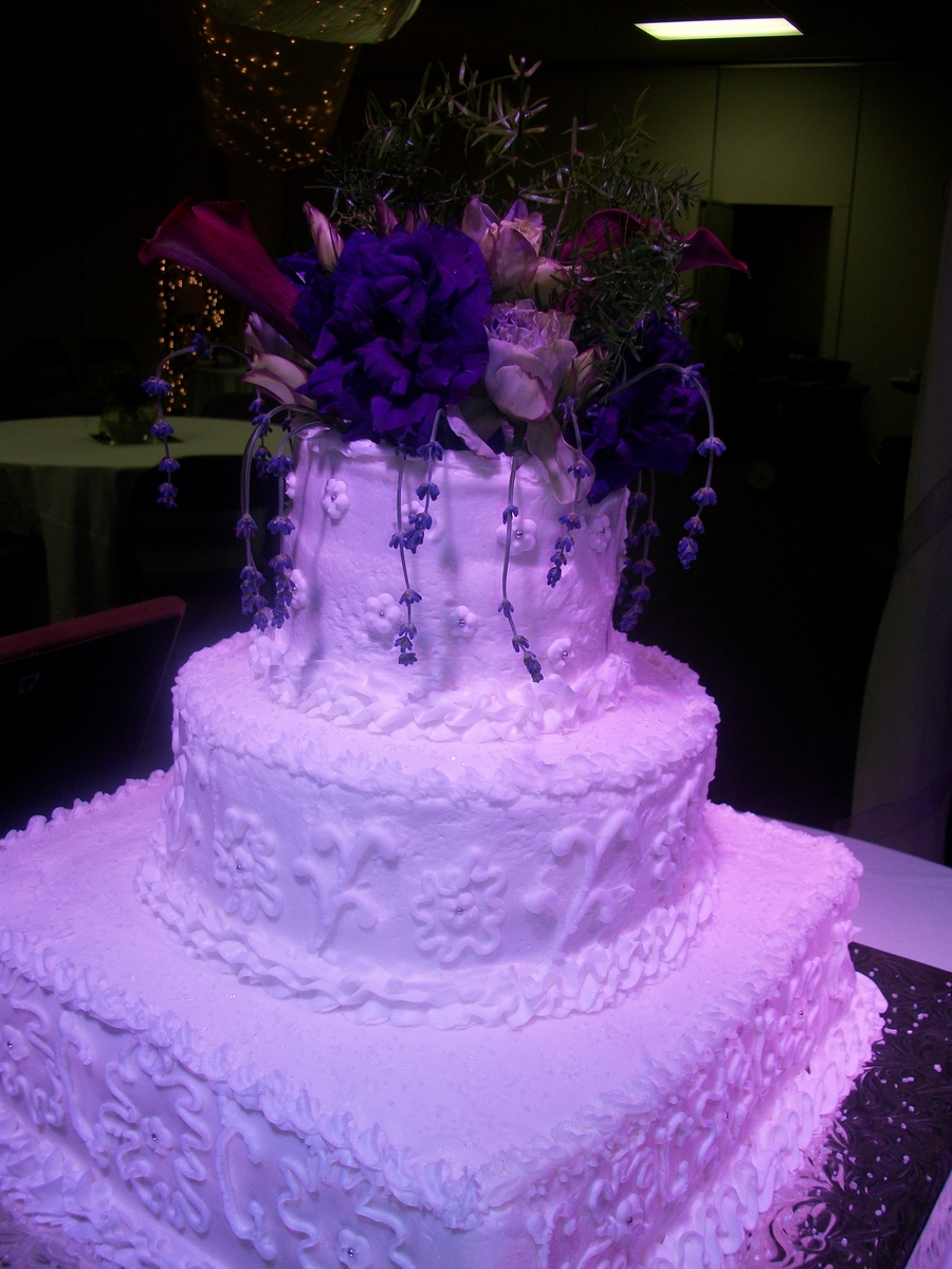 This cake was french vanilla on the bottom. The middle layer was lemon and the top was strawberry. All iced with cream cheese buttercream. The borders and piping were out of pur white buttercream. The small flowers were royal with silver dragees for centers. Thanks for looking.