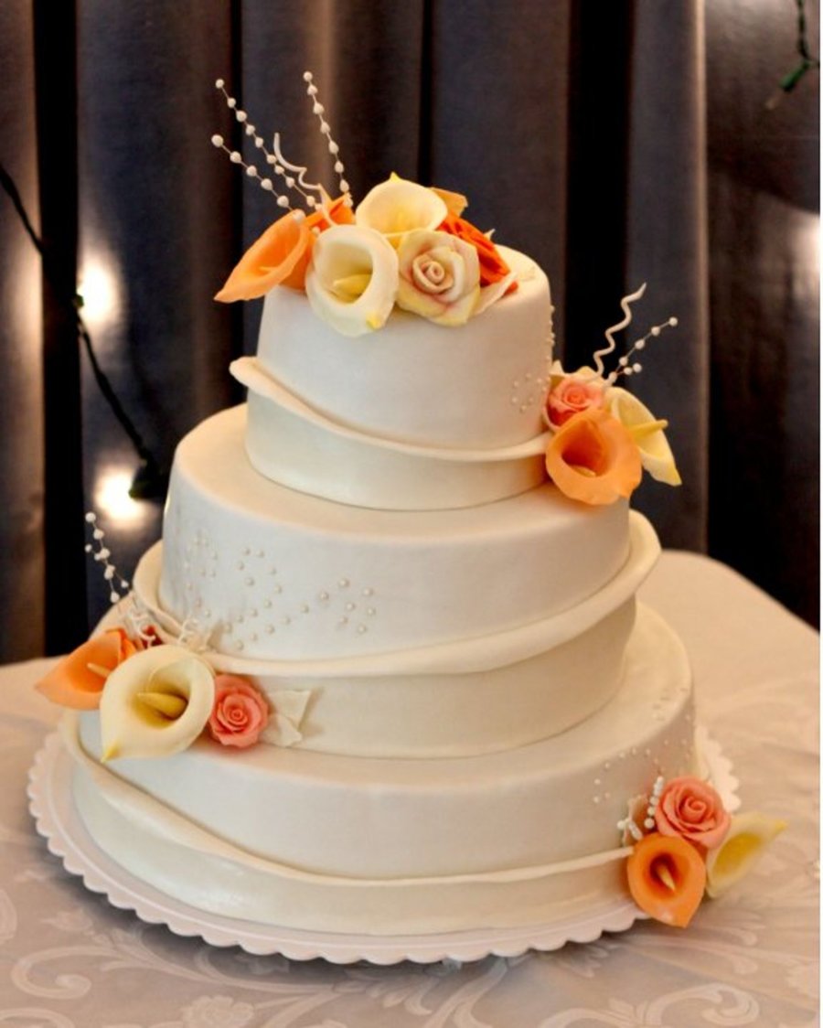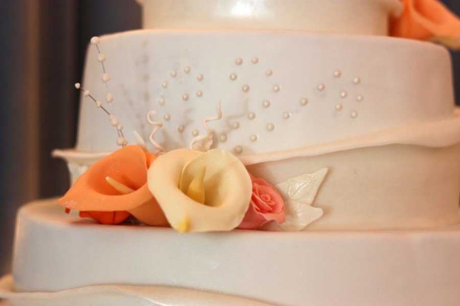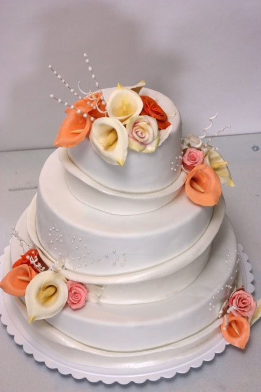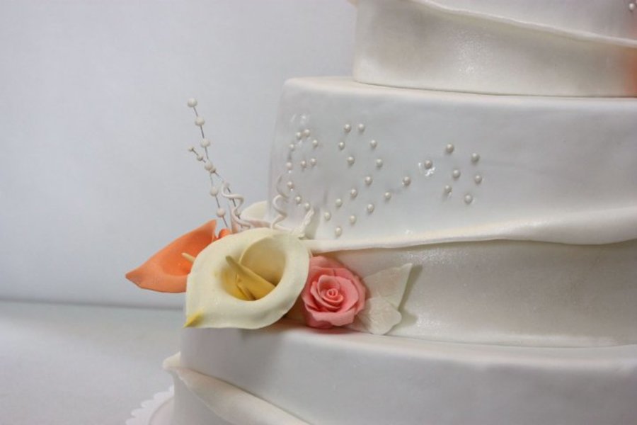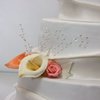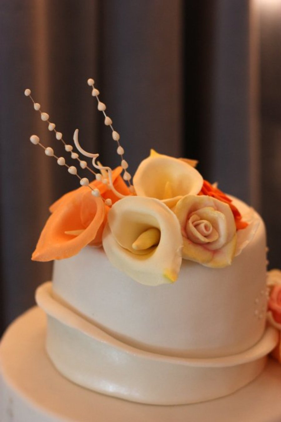 14", 10", 6" fondant covered egg-less cakes. Gum Paste calla lilies, roses, leafs, and swirls. This is our very 1'st wedding cake. Please leave a comment and let us know what you think. Have an absolutely wonderful day!