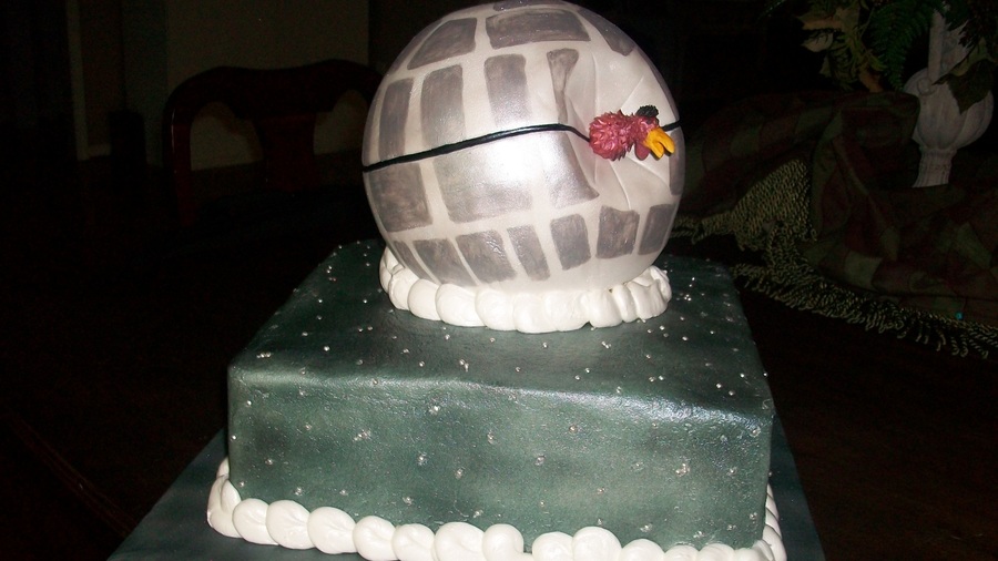 Groom was a University of SC fan so he had to have a gamecock coming out of the death star from star trek. Death Star is made of fondant and then handpainted. Gamecock is made of gumpaste. The bottom "galaxy" is airbrushed with silver dragees added to look like stars.