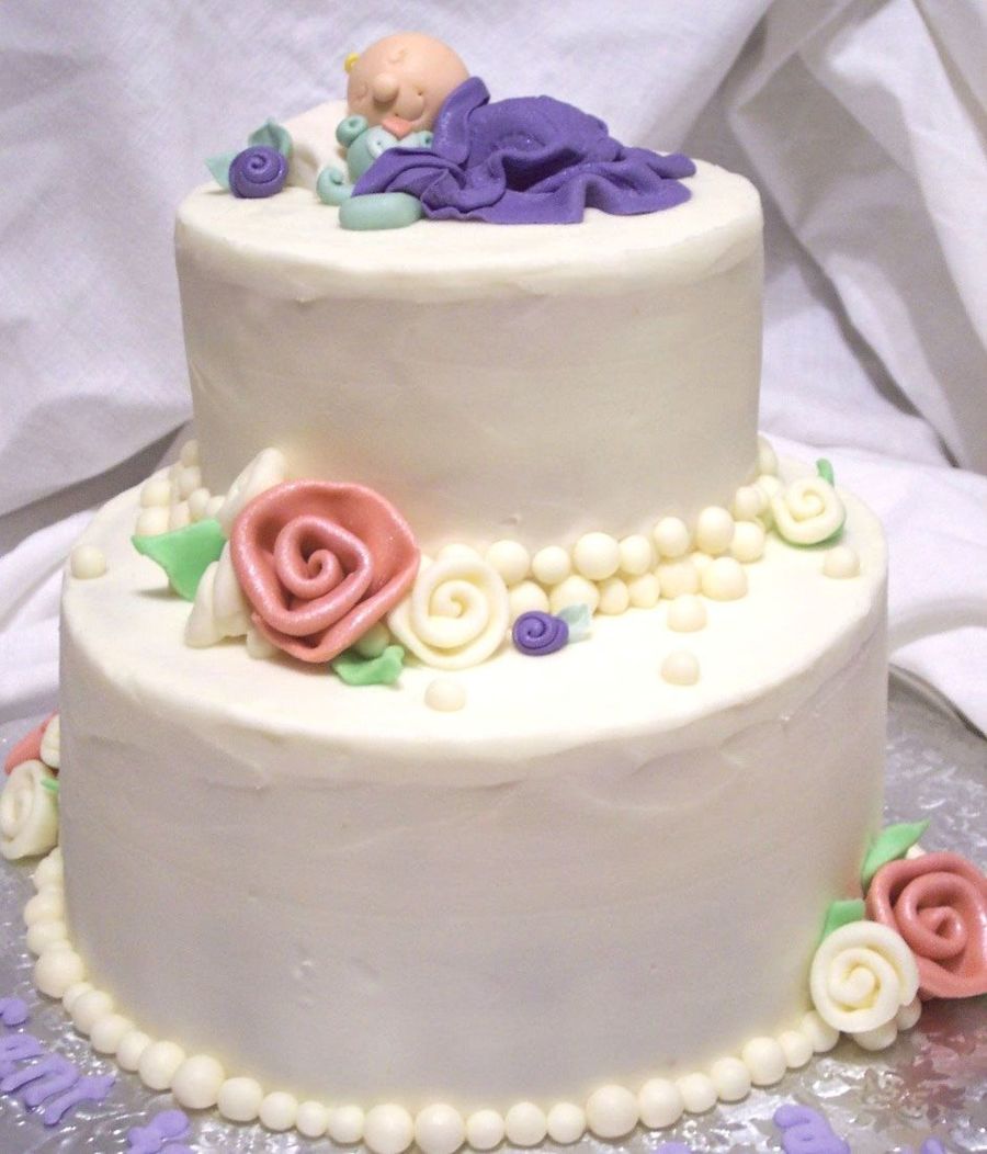 The eyes and mouth of the baby were made by pressing piping tips into the gumpaste.
