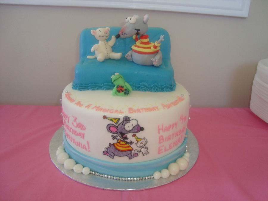 Inspired by yokko and inspireddecorator 's T&B cakes - THANK YOU!!!! A Toopy & Binoo cake for 2 little princesses! Had a design of clouds along the bottom tier and Toopy and Binoo on the couch above in mind, but my clouds were awful!!! Made do with a quick design change at the end and they loved it anyway! Toopy, Binoo, and Patchy Patch are MMF. Picture on front is hand drawn on rice paper. Cake is white cake with Strawberry SMBC. TFL!!!