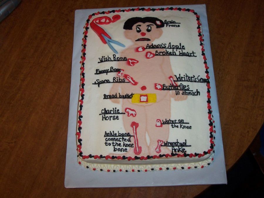 11x15 for a dinner at my nursing school tomorrow! This is my contribution. All buttercream except tweezers. Those are made of fondant.Man is put on by FBCT and smoothed to match cake (well, kinda!) Pieces are piped on as well as words. A lot of fun making this one!