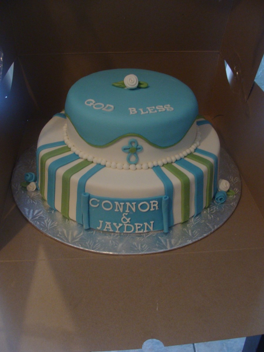 This cake was for my son and my nephews Baptism - the fondant was nearly impossible to work with because of the humidity - so this is the best I could get it. I also wasn't able to get a good picture since I was in such a rush. Design from Cakes by Ashley