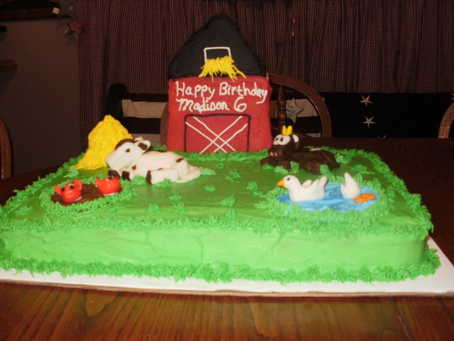 Barnyard cake iced with buttercream, barn is a sugar cookie iced in buttercream animals, mud and pond are made of MMF. Haystack is a mound of MMf covered in yellow buttercream