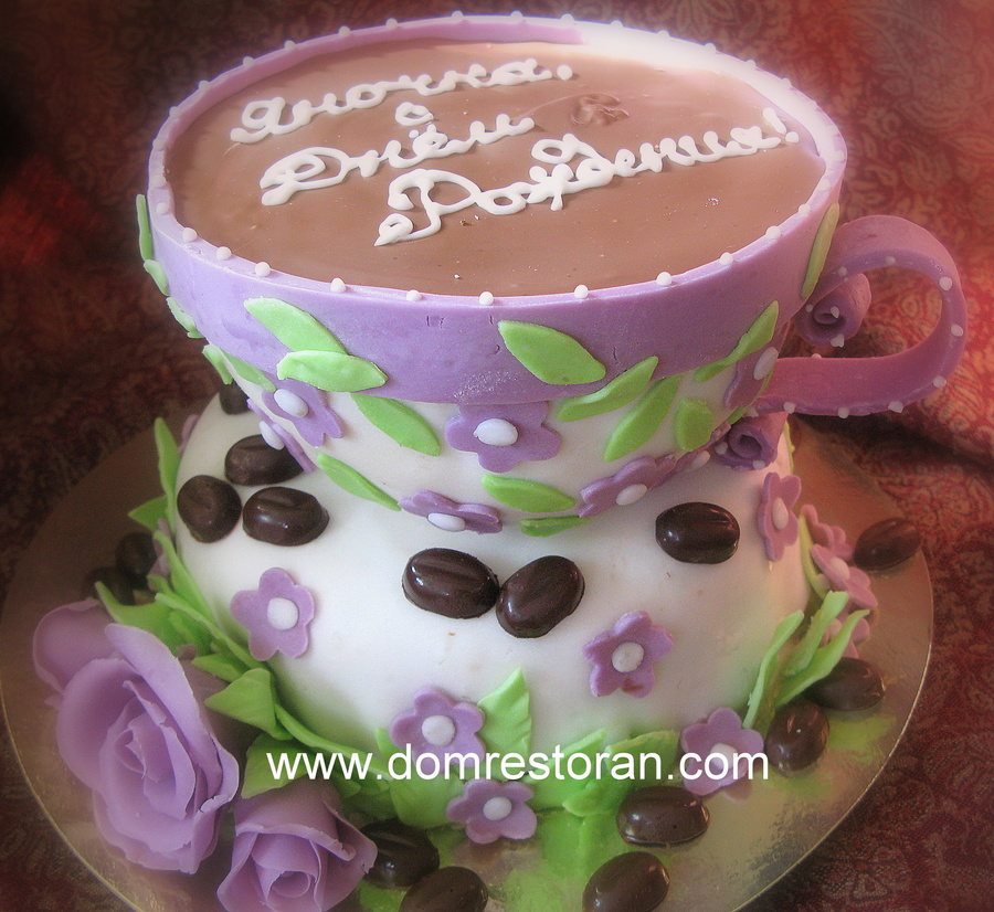 Written in Russian - "Happy Birthday!", surface of a cup filled with chocolate, decorations with gumpaste.
