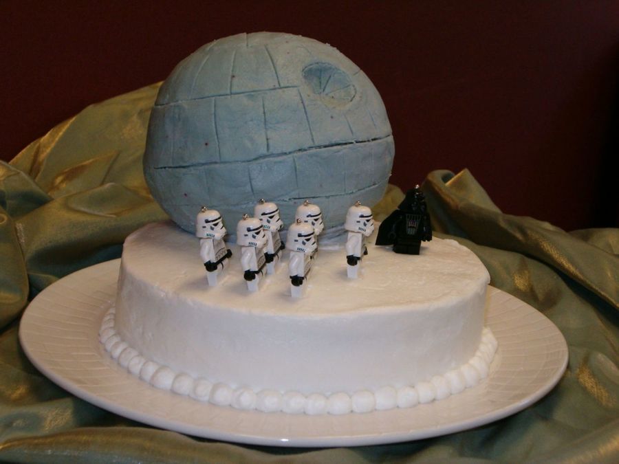 This is the final version of the Death Star for my brother-in-laws grooms cake. The Storm Troopers and Darth Vader are mini Lego keychain figures with the key chains removed.