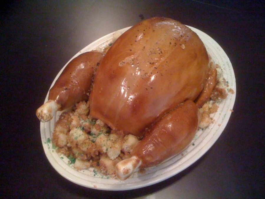 Well just about everyone has done one. I wanted mine to be more realistic. This is a Home made Red velvet cake Filled with our special Cream Cheese icing and covered in our own marshmallow fondant. The Stuffing is white cake and corn syrup and the pepper is chocolate cake crumbs. It is 100% edible. It looks cooked because I torched the fondant and then dripped light corn syrup to make it juicy.