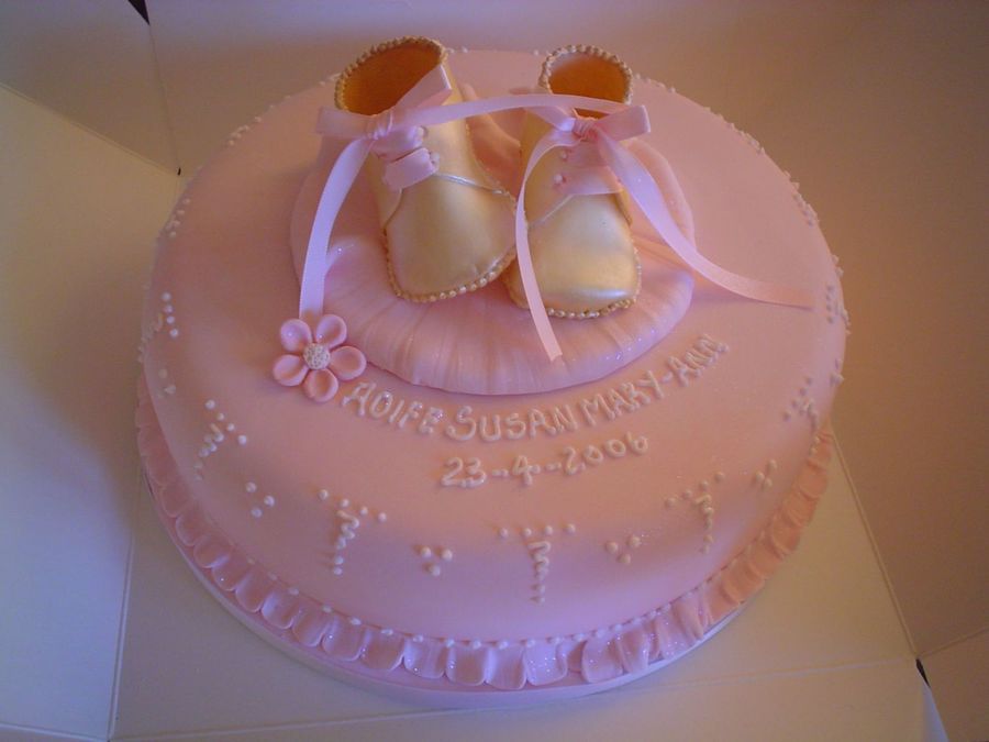 The booties were made from flower paste and painted with ivory pearl dusting powder with vodka added for give them a sheen. I made myself a template I then cut out the three pieces from flower paste and using tissue to keep the shape, left them to dry and added the ribbon to finish off the final look.