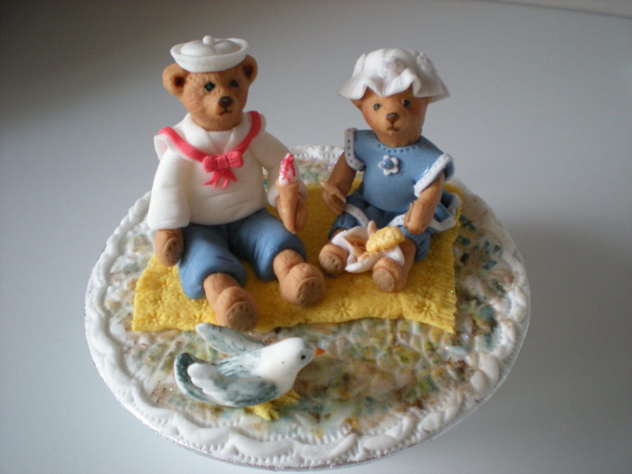 on the beach with an icecream good old english fish and chips and a seagul ready to pinch the left overs it dont get more typicaly english than that. this topper was made for an exhibition about the seaside.all is sugarpaste and the bears heads were moulded with squires kitchen great impressions mould.