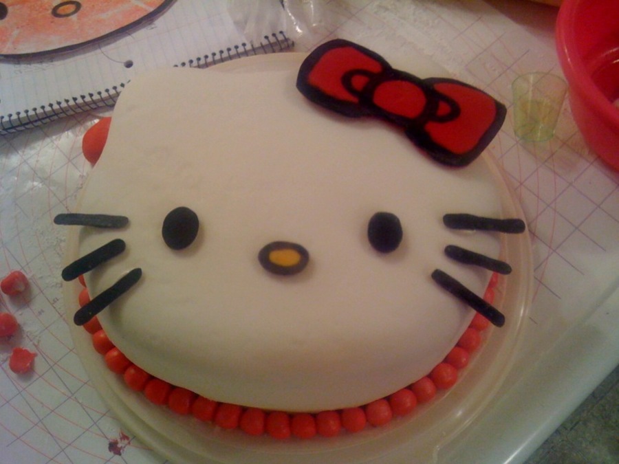 This was my first semi sculpted cake. It was for my BFF's birthday. Shes a huge hello kitty fanatic!! OUTSIDE : marshmellow fondant, the eyes, bow, whiskers are chocolate, fondant balls dusted with red lustre dust INSIDE : red velvet cake with home made cream cheese frosting and pistachio pudding. WIERD COMBO but thats what she wanted lol