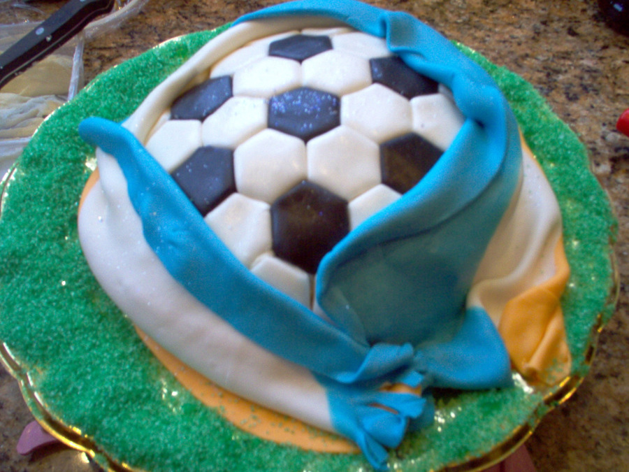 I am a South African expat and feeling very depressed at not being able to be in my country during this exciting time of the soccer world cup. (my son's summer vacation starts 3 days AFTER the world cup ends!) So of course I turn to cake decorating to cheer up a bit, hence the theme of the cake. Inspiration from one of Carol Deacon's books. A quick tip for anyone interested is that the hexagon shape from a baby's shape sorter toy makes the perfect cutter for a soccer ball.