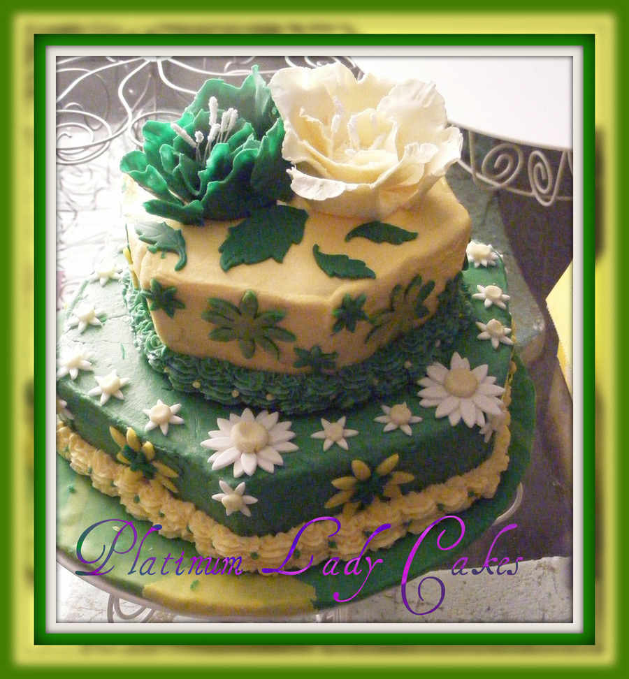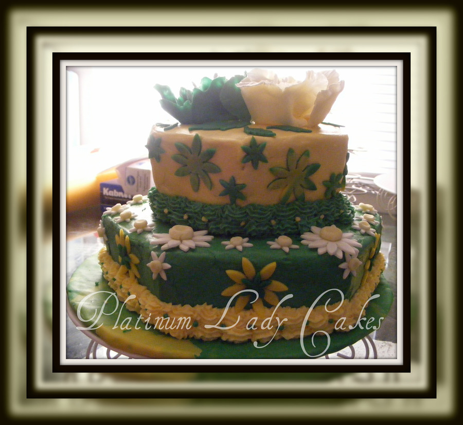 Final cake for Wilton Class cakes frostening were buttercream and the flowers and Daisy are gumpaste and fondant